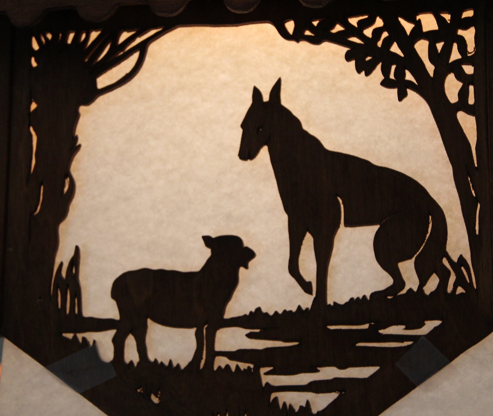 Lorsque nous en étions aux balbutiements de la rénovation du futur gîte, Vincent se baladait régulièrement chez les brocanteurs locaux. Il est un jour tombé en arrêt devant un lustre hexagonal en bois, dont les facettes représentaient des fables de La Fontaine…